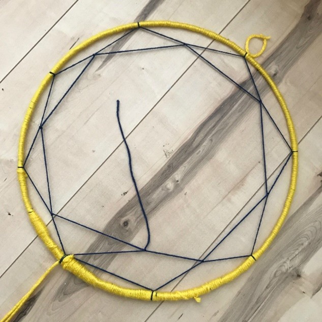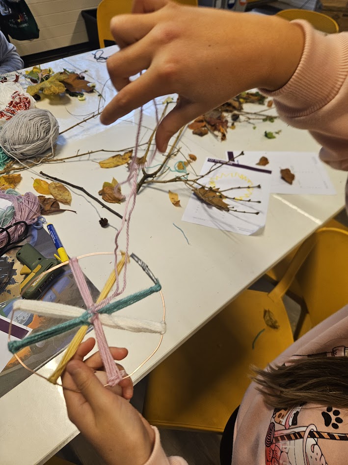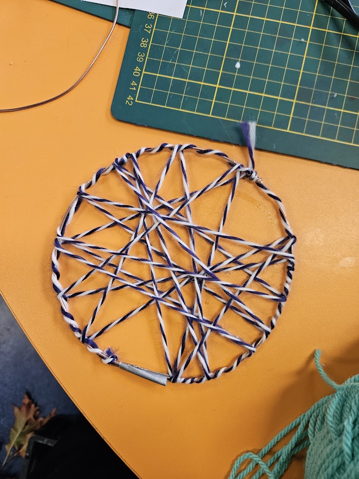 Basis maken: Laat de kinderen de ring voorbereiden door deze te buigen uit staal of wilgen. Let op uiteindes kunnen scherp zijn. Zet de ring indien nodig vast met tape. Daarna laat je de kinderen deze stevig om te wikkelen met wol. Dit vormt de basis van hun dromenvanger.