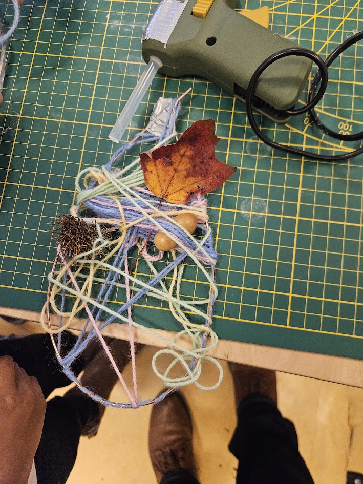 Herfstbladeren en natuurlijke elementen toevoegen: Laat de kinderen bladeren, veertjes en andere herfstmaterialen aan hun ring bevestigen. Dit kan met een lijmpistool of door de elementen in de wol te steken.