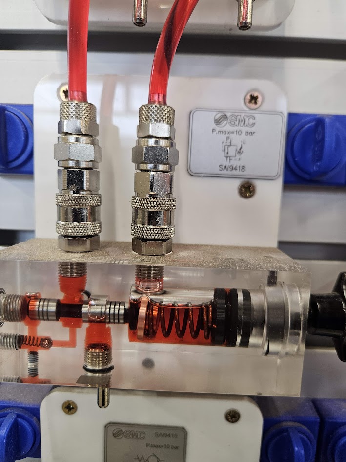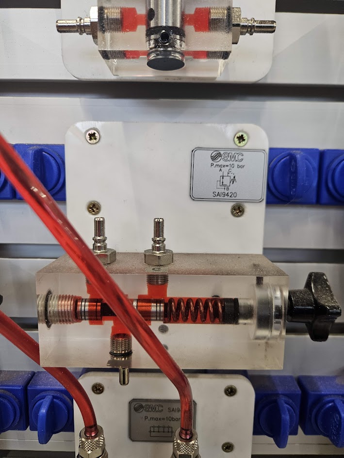 Werkt hetzelfde als het 3/2 veiligheidsventiel alleen is deze gesmoord. Dat voorkomt klapperen dus deze zal mooier aansturen in plaats van in 1 klap open gaan. Denk bijvoorbeeld aan kiepwagen die bovenin stopt, dan wil je dat het systeem stopt met pompen en opvoeren van druk.