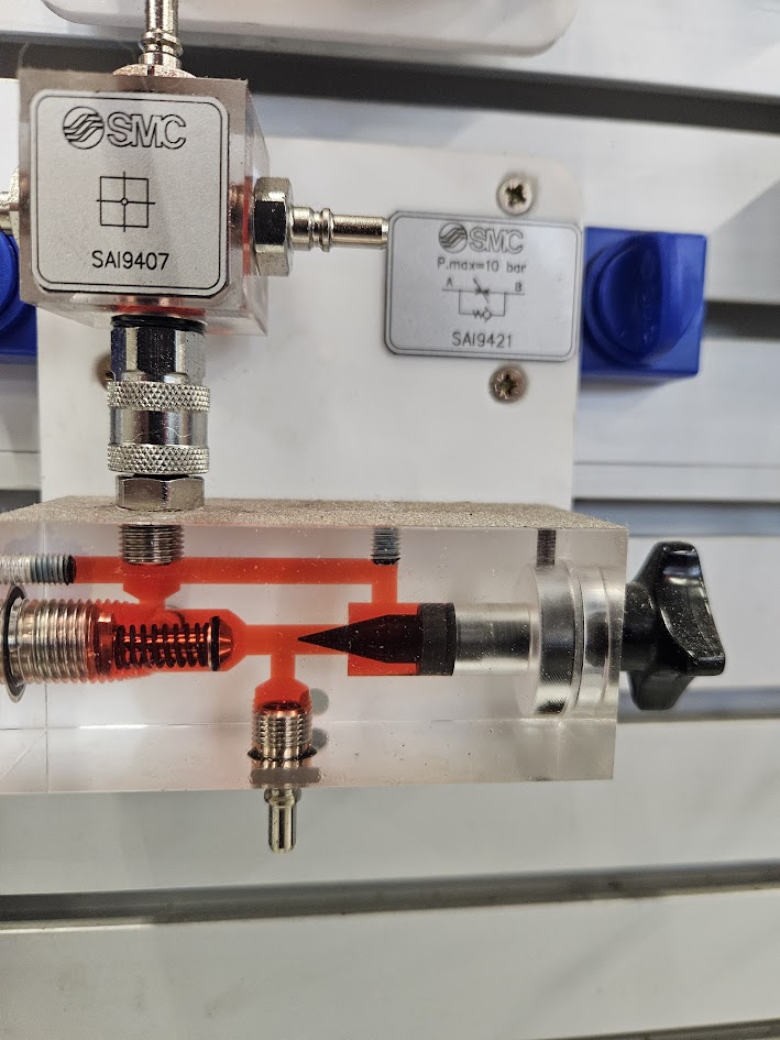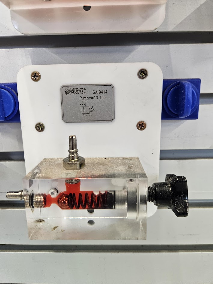 Kan gestuurd de druk van een systeem halen. Dit veiligheidsventiel kan dus overal in het systeem gezet worden omdat deze 3 aansluitingen heeft en kan afvoeren naar de retour. Met de knop is instelbaar bij welke druk deze open gaat. Je kunt hiermee dus ook de kracht van een systeem instellen.